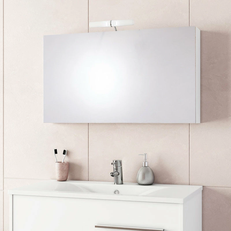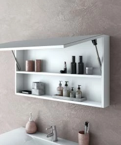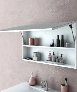 Clean lines and a mirror front give theis medicine cabinet a sleek style. Its space-saving front door swings up to make the most efficient use of your space. Two shelves inside offer storage for all your bathroom necessities.