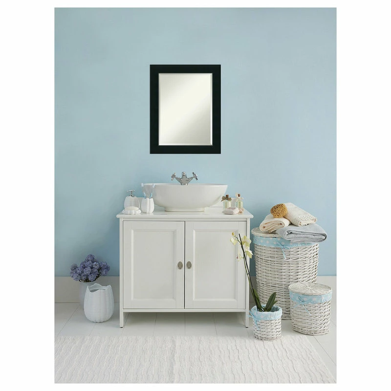 Give your bathroom the finishing touch with this framed wall mirror sized to fit above a standard bathroom sink. The outer dimensions of this mirror will work with a countertop up to 24 inches wide if hung vertically and up to 30 inches wide if hung horizontally. The mirror features a contemporary black frame with a flat surface and a slightly recessed inner lip. The smooth, matte finish will provide a modern look to any room. This mirror is handmade in a small custom art and frame shop in the American heartland – you can be proud to display it in your home