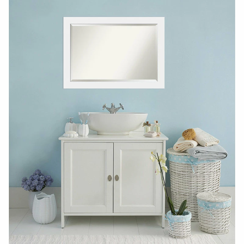 Give your bathroom the finishing touch with this framed wall mirror sized to fit above a standard bathroom sink. The outer dimensions of this mirror will work with a countertop up to 30 inches wide if hung vertically and up to 48 inches wide if hung horizontally. The mirror features a contemporary white frame with a flat surface and a slightly recessed inner lip. The smooth, matte finish will provide a modern look to any room. This mirror is handmade in a small custom art and frame shop in the American heartland – you can be proud to display it in your home.