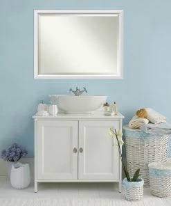 Give your bathroom the finishing touch with this framed wall mirror sized to fit above a standard bathroom sink. The outer dimensions of this mirror will work with a countertop 36 inches wide if hung vertically and up to 48 inches wide if hung horizontally. The mirror features a 2 wide geometric white frame with a flat face and an angled inner edge. Its clean lines and neutral tone will complement your contemporary decor. The finish is a smooth satin white. This mirror is handmade in a small custom art and frame shop in the American heartland – you can be proud to display it in your home.
