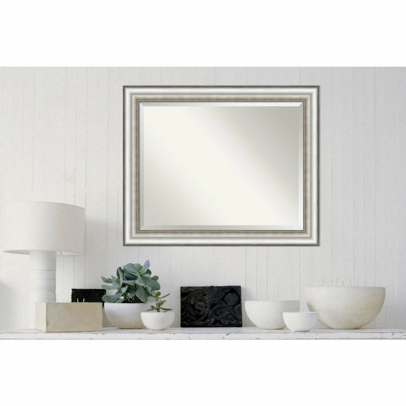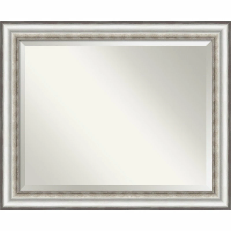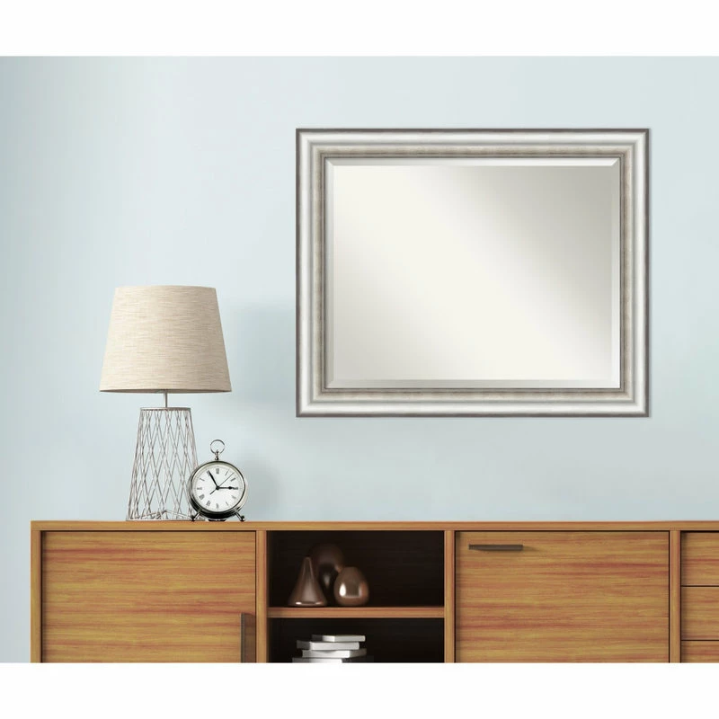 Give your wall or bathroom the finishing touch with this framed, wall mounted mirror. An Amanti Art mirror holds its value with premium finishing that you can appreciate up close. This mirror features a brushed silver frame with distinct dark lines and a finely embossed, dotted pattern over dark silver patina on the inner edge. To position your mirror properly for use in the bathroom, hang it so your reflection fits in the center. A wall mirror can make your space appear larger and more inviting, especially if its a well-placed foyer or living room mirror. Hang it at eye level or position it so it reflects other home decor elements in the room. Amanti Art is headquartered in Madison, WI and provides high quality, handmade framed art, mirrors and organization boards for your home improvement projects. Our home decor products are made using traditional custom framing techniques that give you the kind of quality you’d expect from your local frame shop. Because of our focus on workmanship, our products are used by architects, developers, interior designers and homeowners alike to create beautiful functional living spaces.