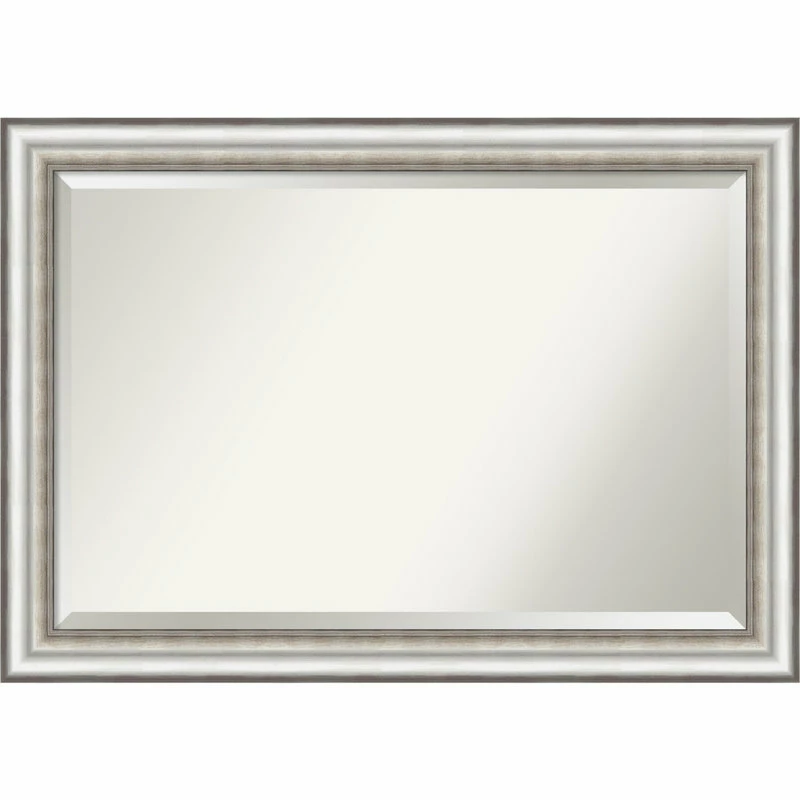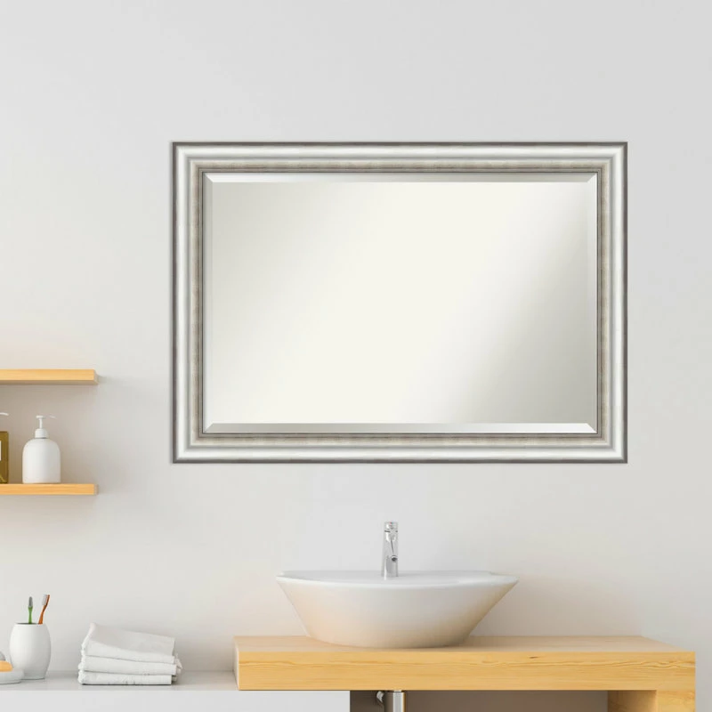 Give your wall or bathroom the finishing touch with this framed, wall mounted mirror. An Amanti Art mirror holds its value with premium finishing that you can appreciate up close. This mirror features a brushed silver frame with distinct dark lines and a finely embossed, dotted pattern over dark silver patina on the inner edge. To position your mirror properly for use in the bathroom, hang it so your reflection fits in the center. A wall mirror can make your space appear larger and more inviting, especially if its a well-placed foyer or living room mirror. Hang it at eye level or position it so it reflects other home decor elements in the room. Amanti Art is headquartered in Madison, WI and provides high quality, handmade framed art, mirrors and organization boards for your home improvement projects. Our home decor products are made using traditional custom framing techniques that give you the kind of quality you’d expect from your local frame shop. Because of our focus on workmanship, our products are used by architects, developers, interior designers and homeowners alike to create beautiful functional living spaces.