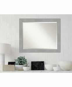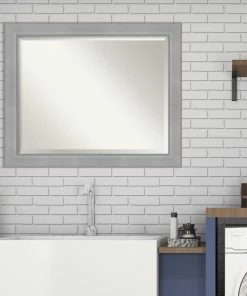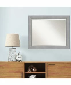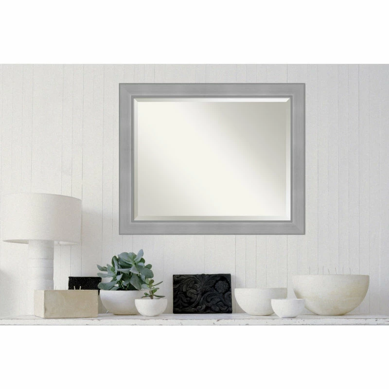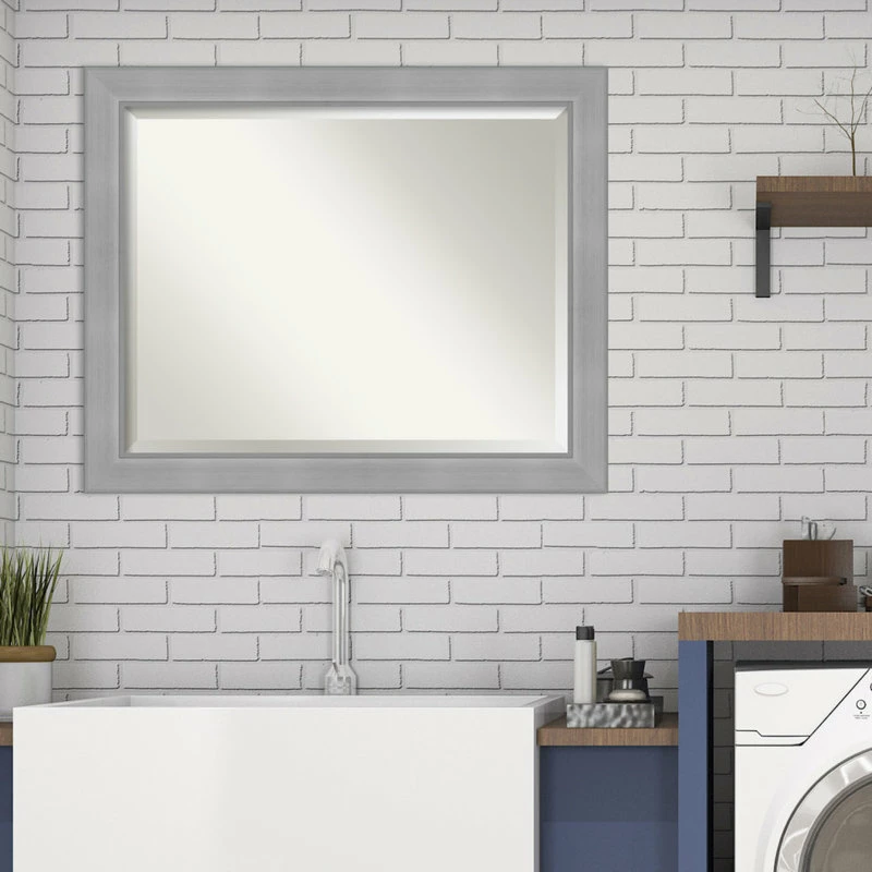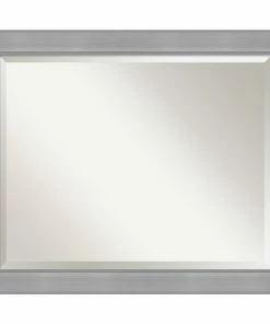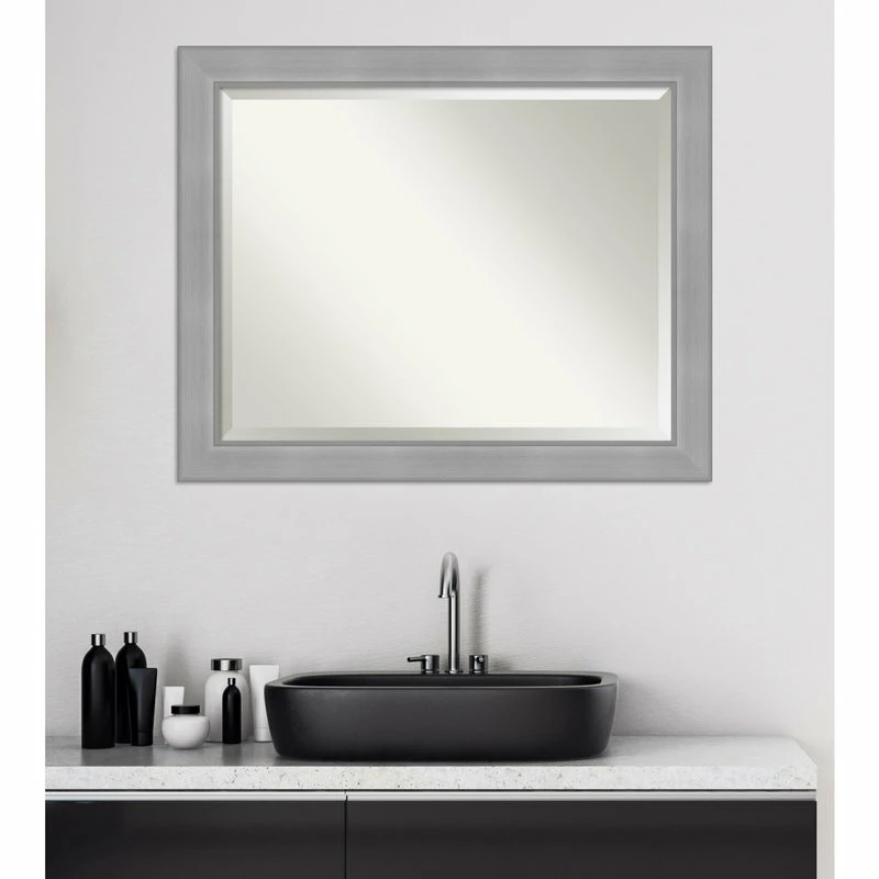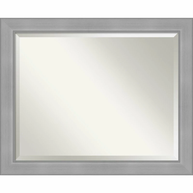 Give your wall or bathroom the finishing touch with this framed, wall mounted mirror. This mirror features a wide, flat brushed metallic light silver frame with smooth matte silver inner and outer edges. A wall mirror can make your space appear larger and more inviting, especially if its a well-placed foyer or living room mirror. Hang it at eye level or position it so it reflects other home decor elements in the room. Amanti Art provides high quality, handmade framed art, mirrors and organization boards for your home improvement projects. Our home decor products are made using traditional custom framing techniques that give you the kind of quality you’d expect from your local frame shop.