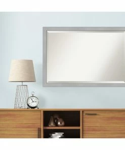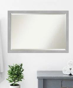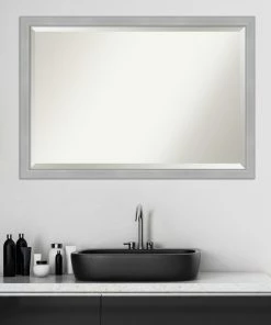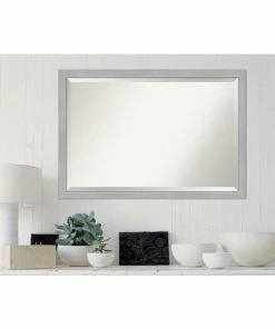 Give your wall or bathroom the finishing touch with this framed, wall mounted mirror. This mirror features a wide, flat brushed metallic light silver frame with smooth matte silver inner and outer edges. A wall mirror can make your space appear larger and more inviting, especially if its a well-placed foyer or living room mirror. Hang it at eye level or position it so it reflects other home decor elements in the room. Amanti Art provides high quality, handmade framed art, mirrors and organization boards for your home improvement projects. Our home decor products are made using traditional custom framing techniques that give you the kind of quality you’d expect from your local frame shop.