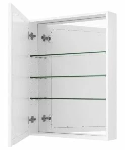 - 1 soft-close door and 3 glass shelves with interior mirrored backing