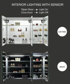 - BUILT-IN DEFOGGER means fogless makeup time is just one touch away. All these features make it the perfect led mirror medicine cabinet.