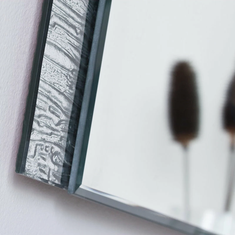 The Molten frameless bathroom mirror is a unique and intricate mirror sure to make a statement in your full or half bathroom. The top mirror is beveled and the bottom mirror is polished outside.