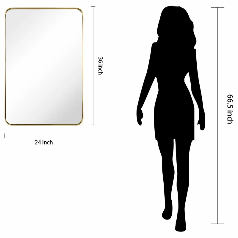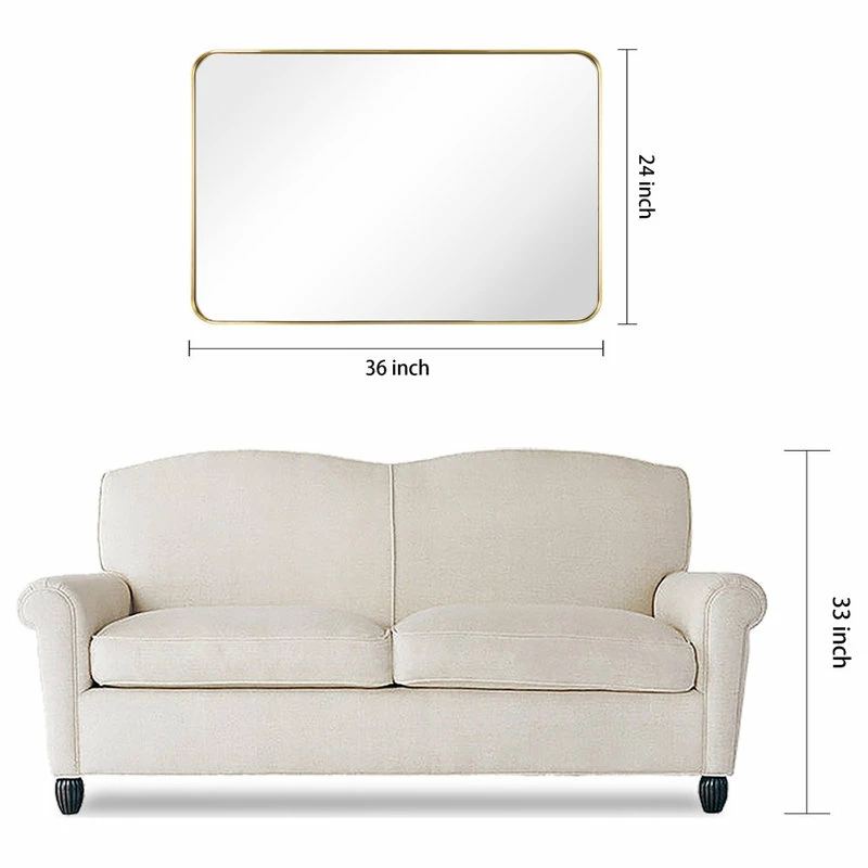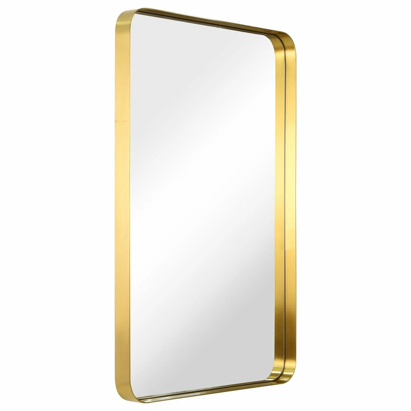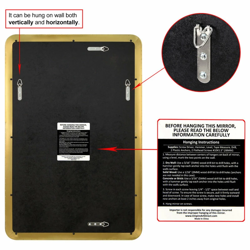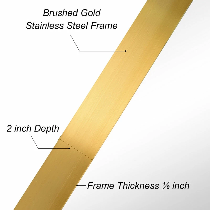 This inspiring 24″ x 36″ rectangular wall mirror is incredible for adding utility and function to wall space without compromising on minimalistic beauty. With a brushed gold stainless-steel frame, this piece embodies the ultimate in quality and modern presentation. This mirror uses silver glass, making sure NO distortion or wrapping. All that is needed to hang this mirror are EZ anchors that can be purchased at your Lowes or Home Depot. 4 strong pre-installed D-Rings are attached to the back of the product for quick and easy installation either vertically or horizontally.
