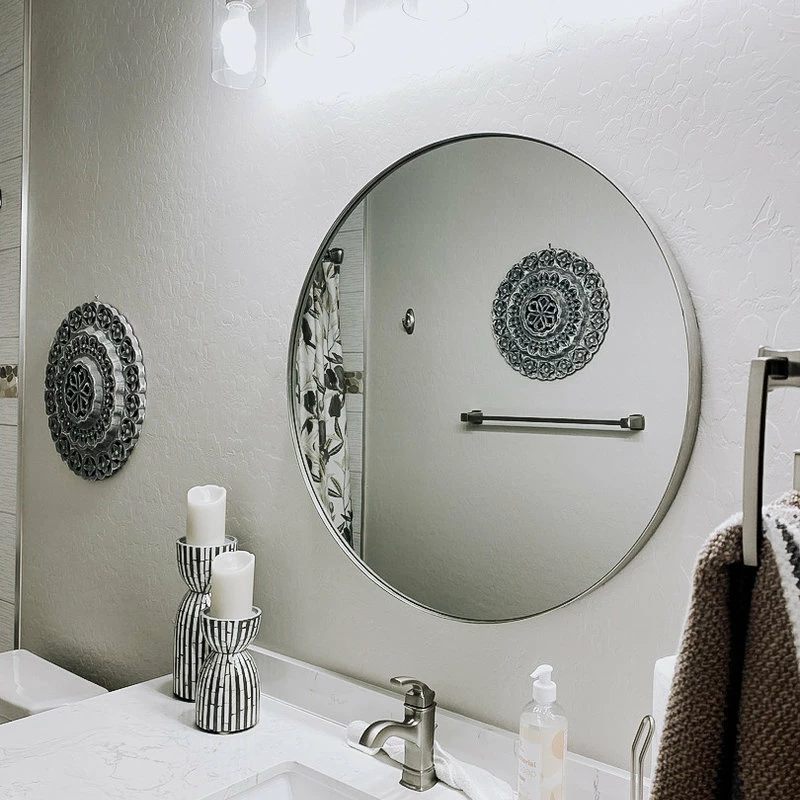 Sleek, modern, beautiful. This gorgeous mirror is sure to dazzle with its high-quality design and ease of installation. 30โณW x 30โณH x 1.5โณD. Hanging hardware (d-rings) installed for quick installation. Screws/anchors included. Felt backer applied to prevent unwanted marks on wall. 1.5โณ frame depth with a high-quality metallic, brushed nickel finish. Approved for high-moisture areas such as bathrooms. Rust proof MDF frame.