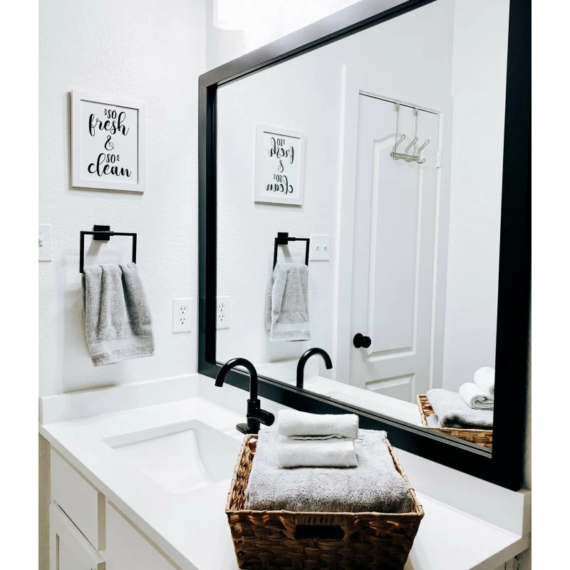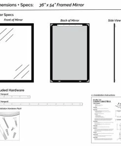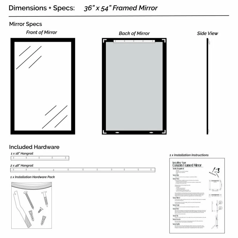 Hangrail for installation will be applied on the width of the frame. All assembly hardware and instructions will be included. Additional hangrails are included if the opposite orientation is desired for installation. The dimensions displayed are the final outside dimensions of the frame, including the mirror. CATII safety backing applied on all mirrors. Approved for high-moisture areas such as bathrooms.