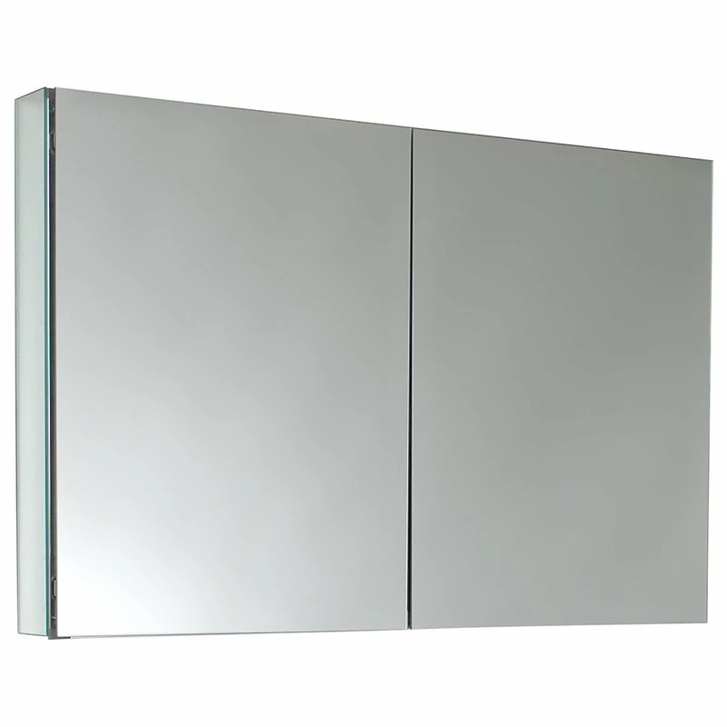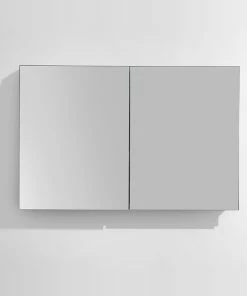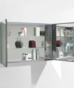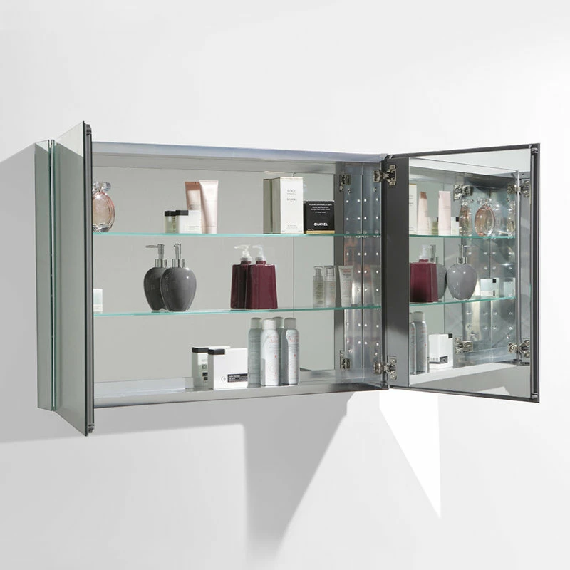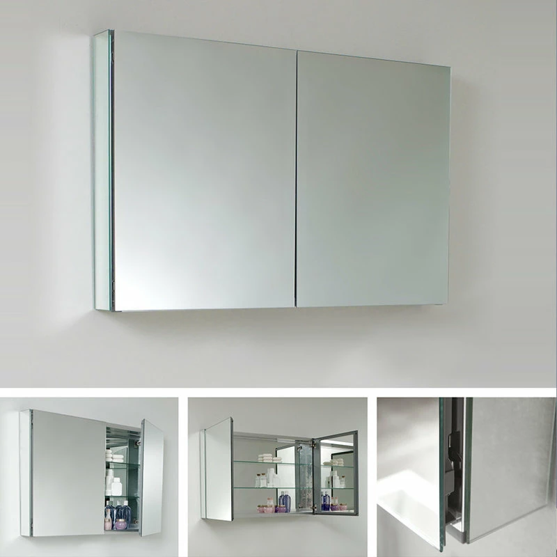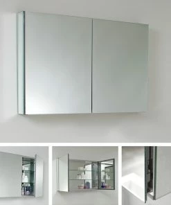 This 40″medicine cabinet features mirrors everywhere. The edges have mirrors and also on the interior of the medicine cabinet. The inside features two tempered glass shelves. Can be wall mounted or recessed into the wall.