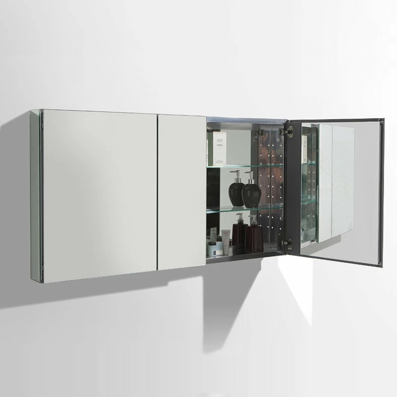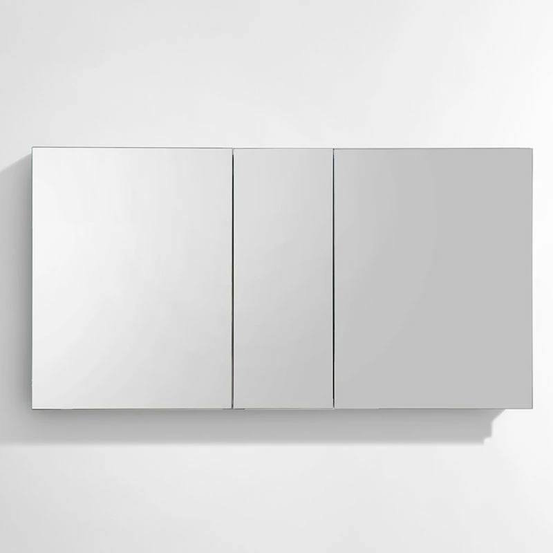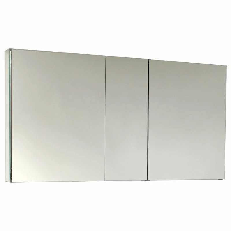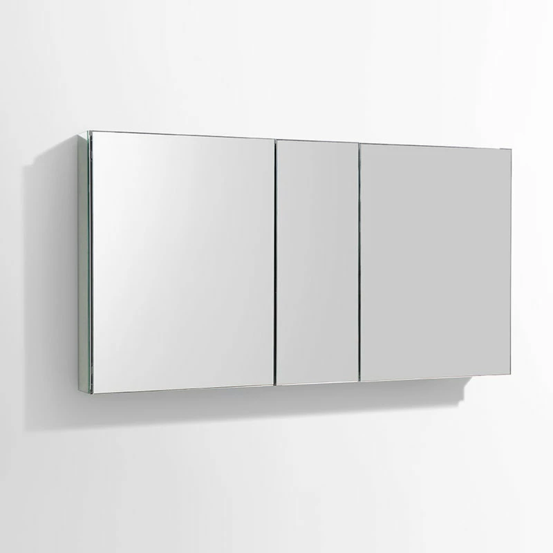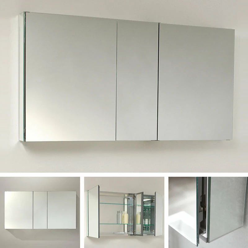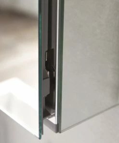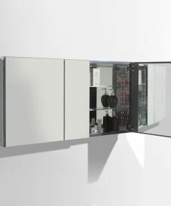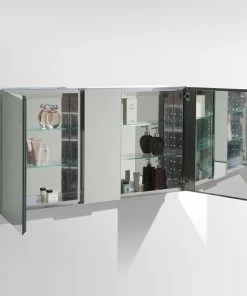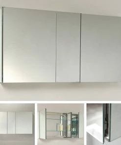 This 50″ medicine cabinet features mirrors everywhere. The edges have mirrors and also on the interior of the medicine cabinet. The inside features four tempered glass shelves. Can be wall mounted or recessed into the wall.