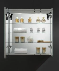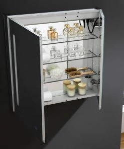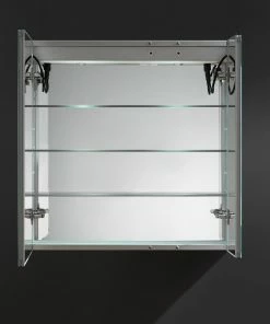 This stylish Fresca Bathroom Medicine Cabinet meets the demands of today’s busy lifestyle, putting modern convenience right in front of you. On the outside, it’s a sophisticated, frameless mirrored medicine cabinet with touch switches for a built-in dimmable surface LED task light, as well as a defogger. Inside, you’ll find three adjustable glass shelves ideal for holding items of varying sizes. The double-sided mirrored doors swing 170 degrees on soft-close BLUM hinges and the back wall of the cabinet is also mirrored. There’s an infrared touch switch for the interior LED light which allows you to find what you’re looking for at any hour. There’s also a handy electrical/USB outlet combo inside for an electric shaver, toothbrush or other essentials, making your morning and evening grooming tasks easier than ever. A brilliant combination of elegance and convenience, the simple frame and neutral tone of the Fresca Bathroom Medicine Cabinet will beautifully complement any dΓ©cor. It can be wall mounted or recessed and features an anodized aluminum frame which creates a moisture and dust resistant interior. Both mirrored doors have plastic corners. In addition to all of these great features, this particular style is equipped with a digital clock option. This medicine cabinet measures 30″W x 30″H x 5″D and is available in several sizes.Fresca FMC013030 Features: