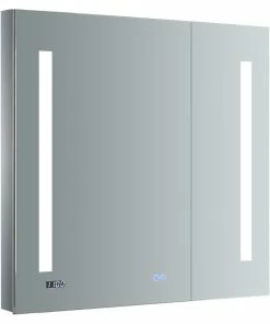 This stylish Fresca Bathroom Medicine Cabinet meets the demands of today’s busy lifestyle, putting modern convenience right in front of you. On the outside, it’s a sophisticated, frameless mirrored medicine cabinet with touch switches for a built-in dimmable surface LED task light, as well as a defogger. Inside, you’ll find three adjustable glass shelves ideal for holding items of varying sizes. The double-sided mirrored doors swing 170 degrees on soft-close BLUM hinges and the back wall of the cabinet is also mirrored. There’s an infrared touch switch for the interior LED light which allows you to find what you’re looking for at any hour. There’s also a handy electrical/USB outlet combo inside for an electric shaver, toothbrush or other essentials, making your morning and evening grooming tasks easier than ever. A brilliant combination of elegance and convenience, the simple frame and neutral tone of the Fresca Bathroom Medicine Cabinet will beautifully complement any dΓ©cor. It can be wall mounted or recessed and features an anodized aluminum frame which creates a moisture and dust resistant interior. Both mirrored doors have plastic corners. In addition to all of these great features, this particular style is equipped with a digital clock option. This medicine cabinet measures 30″W x 30″H x 5″D and is available in several sizes.Fresca FMC013030 Features: