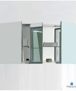 This 50″ medicine cabinet features mirrors everywhere. The edges have mirrors and also on the interior of the medicine cabinet. The inside features four tempered glass shelves. Can be wall mounted or recessed into the wall.