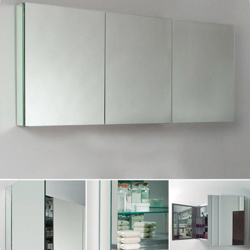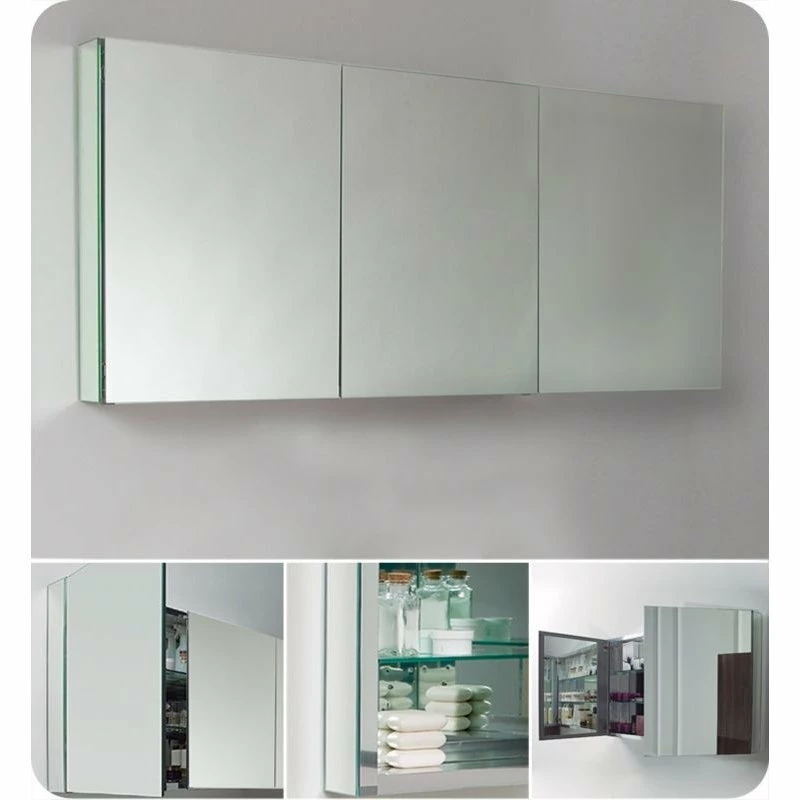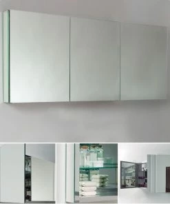 This 60″ medicine cabinet features mirrors everywhere. The edges have mirrors and also on the interior of the medicine cabinet. The inside features two tempered glass shelves. Can be wall mounted or recessed into the wall.Features: