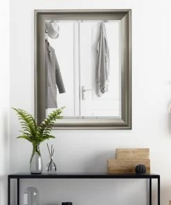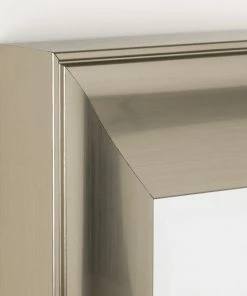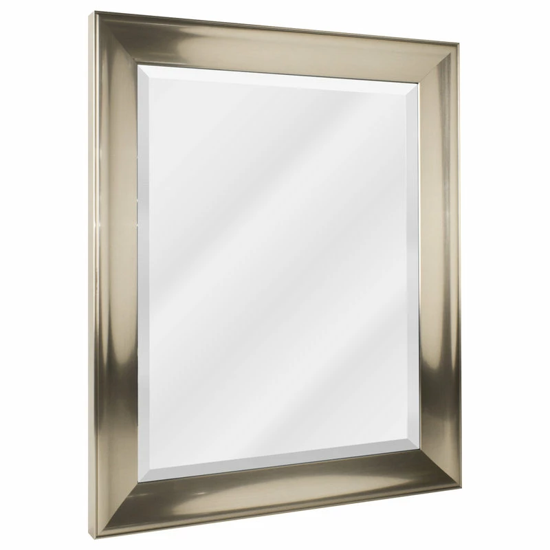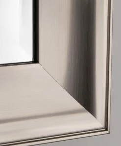This mirror features a sleek, brushed-nickel frame designed in a transitional-style to suit both contemporary and traditional decor. Its beveled glass construction gives it a brilliant shine when it catches the light just right. This little detail elevates the piece’s luxurious and elegant allure, making an already beautifully made piece even better.