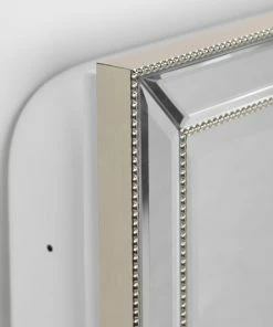 DECORATIVE AND FUNCTIONAL WALL MIRROR – This luxurious beveled mirror cabinet, inlaid with champagne silver beading, combines fashion and function into one eye-catching and convenient piece.