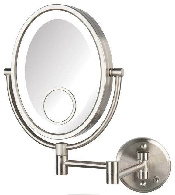 The Jerdon HL9515NLD 8โx10โ Dual sided 10X Magnified LED Wall Mount Direct Wire Mirror is used in luxury hotels and spas because of its convenience, sleek look and precise magnification. With an 8โX10โ oval mirror with 10X and 1X magnification that includes a 15X spot mirror, you can be sure that every detail of your hair and makeup are beautiful and flawless. The LED light is designed around the perimeter of the mirror to distribute light evenly. The HL9515NLD extends 14-inches from the wall and allows for movement at different angles. The on/off switch on the base will activate the LED lighting when you need it. This mirror has an attractive nickel finish that protects against moisture and condensation. The HL9515NLD designed to be a direct wire mirror and connects to an existing junction box on the wall. This beauty accessory comes complete with mounting hardware for an easy installation.