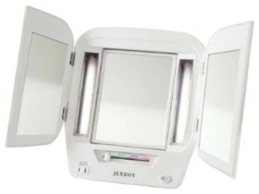 The Jerdon JGL10W Euro Tabletop Tri-Fold Two-Sided Lighted Makeup Mirror is a bathroom and makeup mirror with cool to the touch fluorescent lighting and adjustable side mirrors that fit nicely on any tabletop. Adjustable magnification, versatile illumination and multiple viewing angles make this tri-fold mirror perfect for your beauty needs. The Euro makeup mirror is a highly stylized version of the classic top-selling JGL9W Tri-Fold Mirror. Designed with a sleek contemporary look and attractive white finish to match any home decor, the JGL10W stands up by itself on your countertop, vanity or dresser with a folding back stand. The glare free fluorescent lighting has (4) adjustable settings for color correct lighting selections ideal for daytime, evening, home and office environments. The JGL10W’s center mirror swivels from 1x to 5x magnification so every detail of your hair and makeup are in place, while the (2) side mirrors are adjustable for a panoramic view. This tri-fold mirror also provides a convenient 120-volt electrical outlet built-in for curling irons, blow dryers and other appliances. This mirror is 13.8-inches (L) by 3.75-inches (W) by 12.25-inches (H) in size and folds flat for travel or easy storage. The Jerdon JGL10W Euro Tabletop Tri-Fold Two-Sided Lighted Makeup Mirror comes with a 1-year limited warranty that protects against any defects due to faulty material or workmanship. The Jerdon Style company has earned a reputation for excellence in the beauty industry with its broad range of quality cosmetic mirrors (including vanity, lighted and wall mount mirrors), hair dryers and other styling appliances. Since 1977, the Jerdon brand has been a leading provider to the finest homes, hotels, resorts, cruise ships and spas worldwide. The company continues to build its position in the market by both improving its existing line with the latest technology, developing new products and expanding its offerings to meet the growing needs of its customers.
