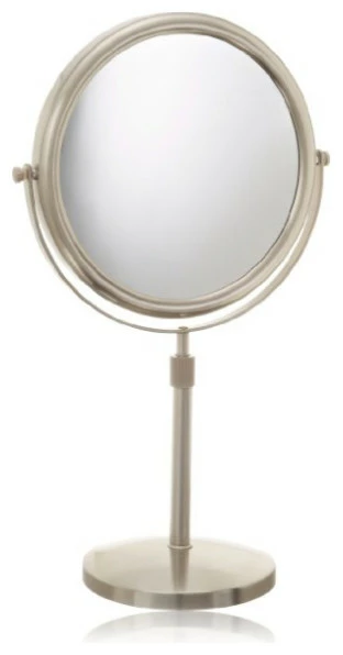 The Jerdon JP4045N 9-Inch Tabletop Two-Sided Swivel Vanity Mirror is an ideal bathroom and makeup accessory with various height and magnification options to make your application process simple and catered specifically to your needs. This chrome finished tabletop mirror can adjust anywhere from 16.5-inches to 21.5-inches in height and stands upright on countertops, vanities and tables. The JP4045N mirror measures 9-inches in diameter, has a smooth 360-degree swivel rotation and features reversible 1x and 5x magnifications to make sure every detail of your hair and makeup are in place. The nickel finish provides an attractive look and protects against moisture and condensation. This mirror is very portable with a 3.65-pound weight, while being firm enough to keep in place and provide a dynamic point of view. The Jerdon JP4045N 9-Inch Tabletop Two-Sided Swivel Vanity Mirror comes with a 1-year limited warranty that protects against any defects due to faulty material or workmanship. The Jerdon Style company has earned a reputation for excellence in the beauty industry with its broad range of quality cosmetic mirrors (including vanity, lighted and wall mount mirrors), hair dryers and other styling appliances. Since 1977, the Jerdon brand has been a leading provider to the finest homes, hotels, resorts, cruise ships and spas worldwide. The company continues to build its position in the market by both improving its existing line with the latest technology, developing new products and expanding its offerings to meet the growing needs of its customers.