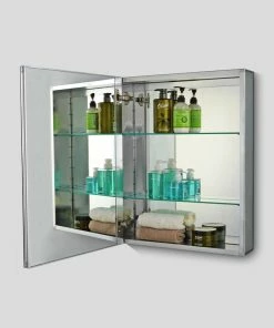 - Mirrored interior behind door and shelves for a modern look. Door features slotted finger pull on the underside. Cabinets can be inverted for right or left swing installation. Shelf Material: Tempered Glass