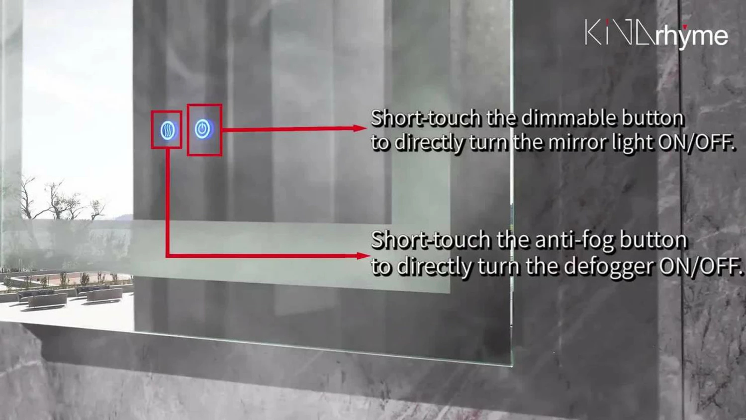 2-Button: The mirror power switch and anti-fog switch are separate control, anti-fog according to need to open and close, safe and energy-saving. The defogging function may take 5-10 minutes to completely cover/clear the entire bathroom mirror, please turn on this function before you use it. Touch the power switch button for 2-3 seconds to adjust the brightness from 10% to 100%. Brightness will be stored automatically.