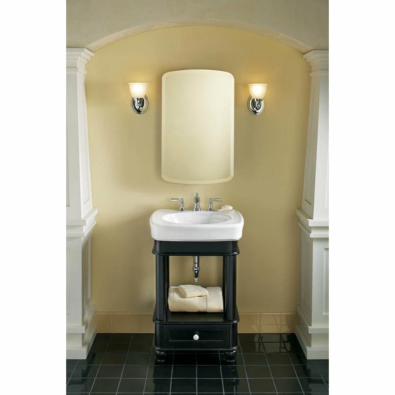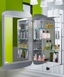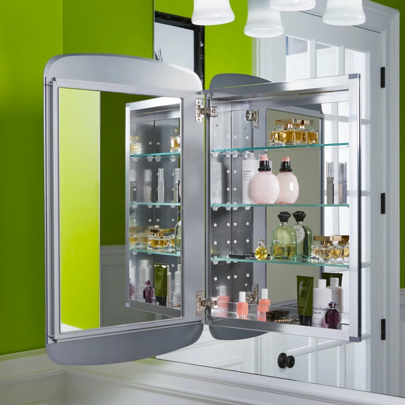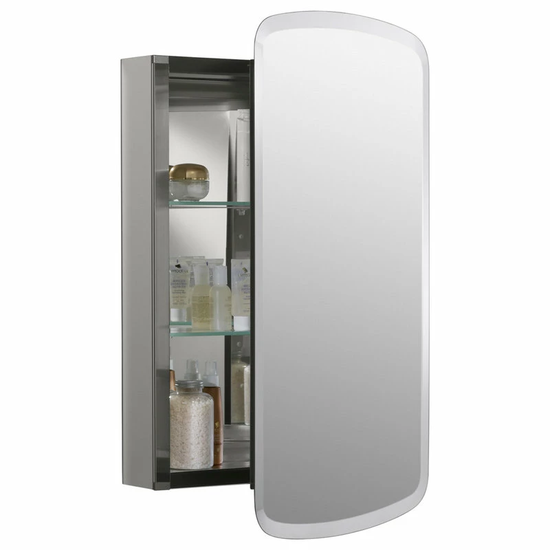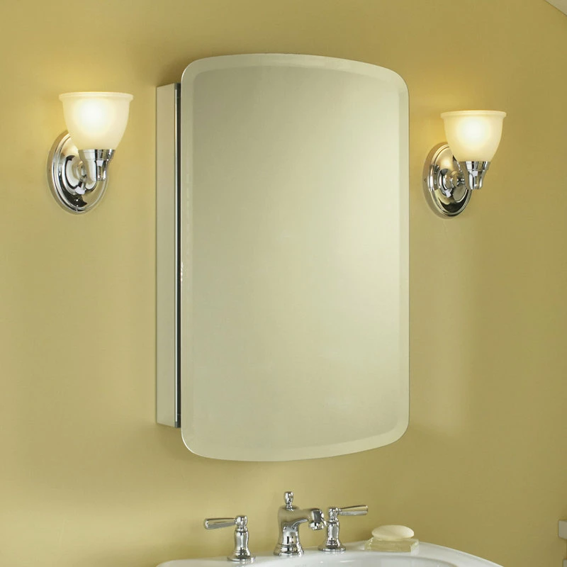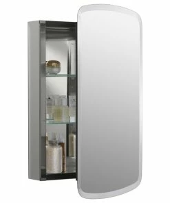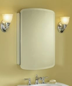This mirrored cabinet features a 1″ beveled frameless door that can be installed with a left or right hinge. Inside, two adjustable 1/4″ glass shelves hold all your toiletries and bath items in front of a beautifully mirrored rear wall. Rust-free aluminum construction ensures years of use, and installation has never been easier with the included side kit, allowing for either recess or surface-mount installations.Features: