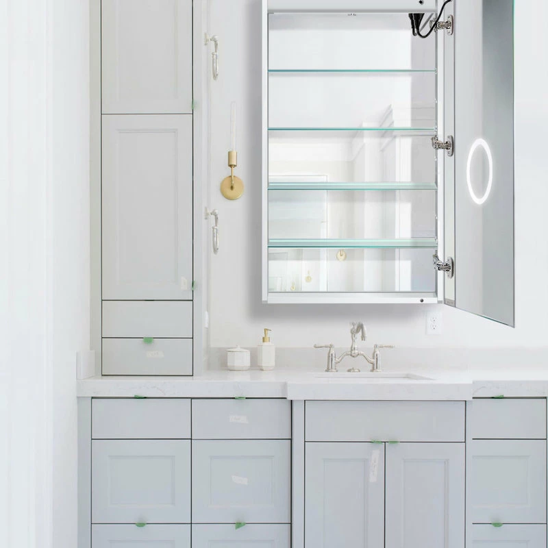 Our LED Medicine Cabinet is a symphony of design elements. We combined our most powerful lighting advancements to create a beautiful storage solution an expression of luxury and function for your bath. From a distance, the LED border produces a striking, modern glow. Up close, enjoy unparalleled light dispersion on the face and body. Effortless to use, a revolutionary touch icon is integrated into the mirror face for seamless on/off toggling and dimming with memory functionality Open the lighted section cabinet to reveal the full suite of amenities. In the mirrored door, a 3x magnified, LED-lit mirror is perfect for detailed makeup application. The mirrored interior is illuminated automatically for a luxurious touch. Our wide-angle hinges provide freedom of motion and panorama. The 2+2 smart outlet contains two traditional outlets and two USB interfaces to keep beauty tools, as well as a smartphone or tablet, close at hand. We ensure reliable optical clarity with active defogging technology. This LED Medicine Cabinet is limited only by your imagination.