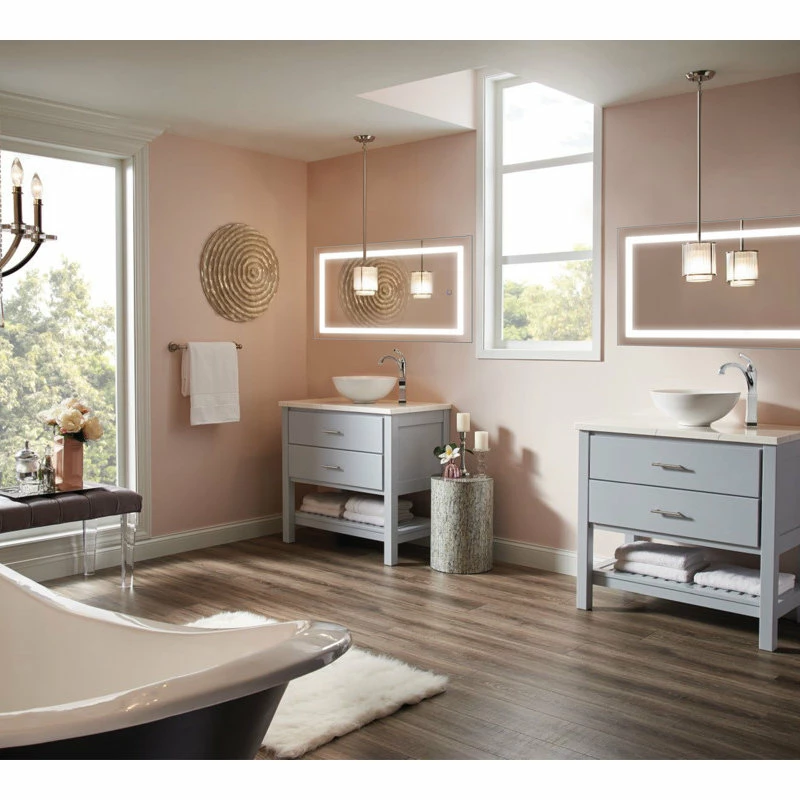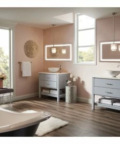 The large-scale bathroom lighted mirror features unique box-in-frame LED lighting that provides accent illumination that doesn’t overwhelm the interior space.