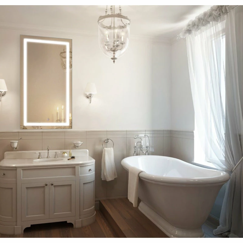- The LED strips for the lighted vanity wall mirror are embedded behind frosted glass, so the mirror provides task lighting without distracting glare