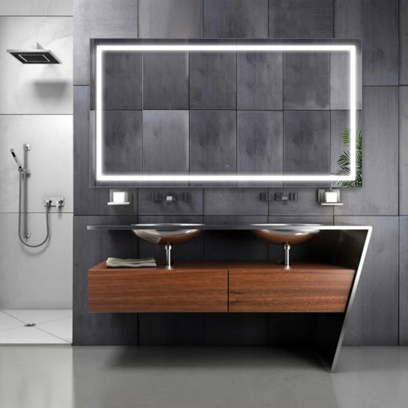 The large-scale bathroom lighted mirror features unique box-in-frame LED lighting that provides accent illumination that doesn’t overwhelm the interior space.