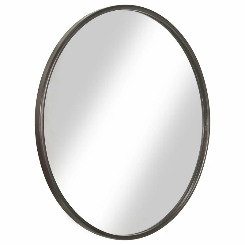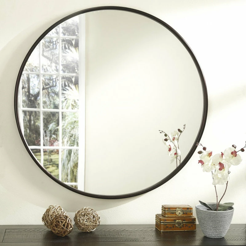 The Round Mirror Collection is a classic round circle style mirror with a slim metal frame. The metal frame is finished in an Oil Rubbed Bronze or Antique Pewter that is able to complement most furniture and hardware options. The extra-large 36β diameter design helps open up any living room, bedroom, hallway, or bathroom. This mirror is designed to be wall-mounted with two keyhole hooks that are provided on the back of the mirror. This mirror is intended to be hung without the use of a wire. Made in China. Product Materials: Metal, Glass. Overall Dimensions: 36β H x 36 Wβ x 1β D. Glass Dimensions 34β x 34β