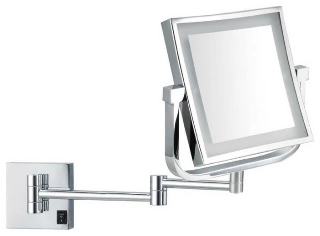 A LED lighted wall mounted makeup mirror, this model feautures an 8″ square mirror face . Its stylish square shape comes with 5x magnification and built in LED lights. Along with that, it can be ordered with chrome color. The double arm design and built in on/off switch in the base makes it a functional and stylish addition to your bathroom.