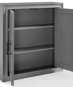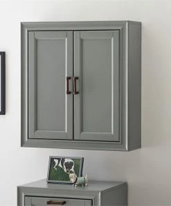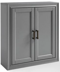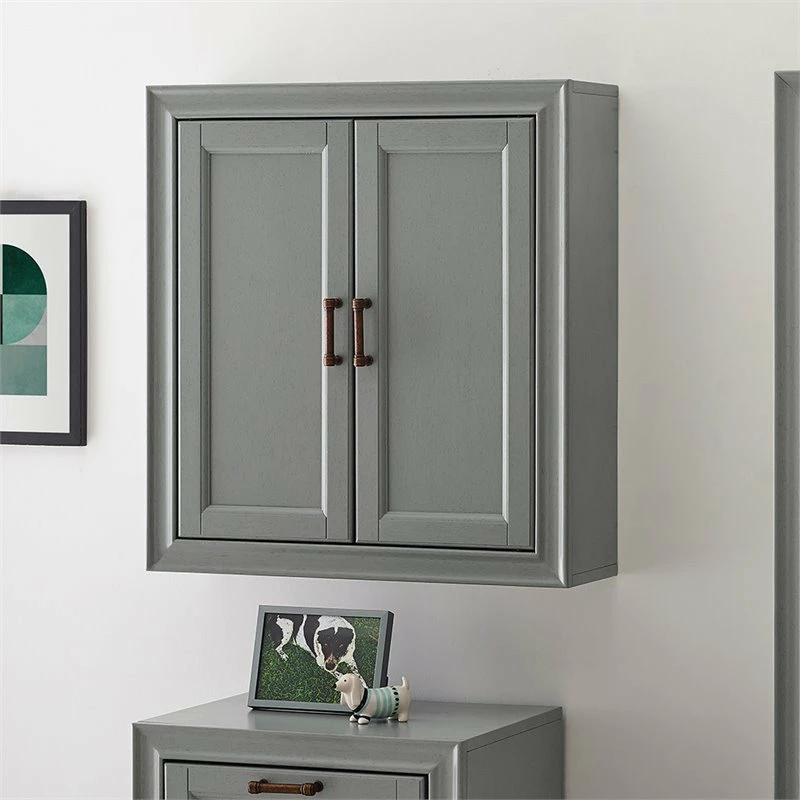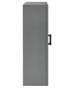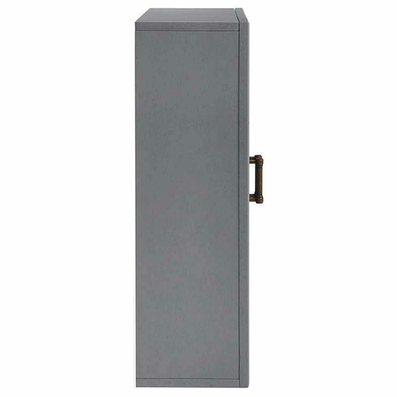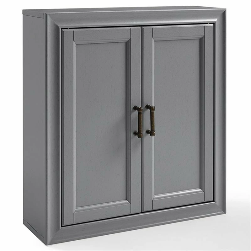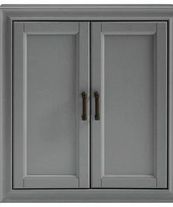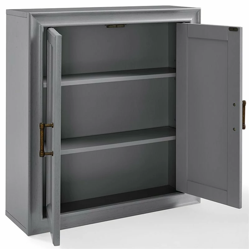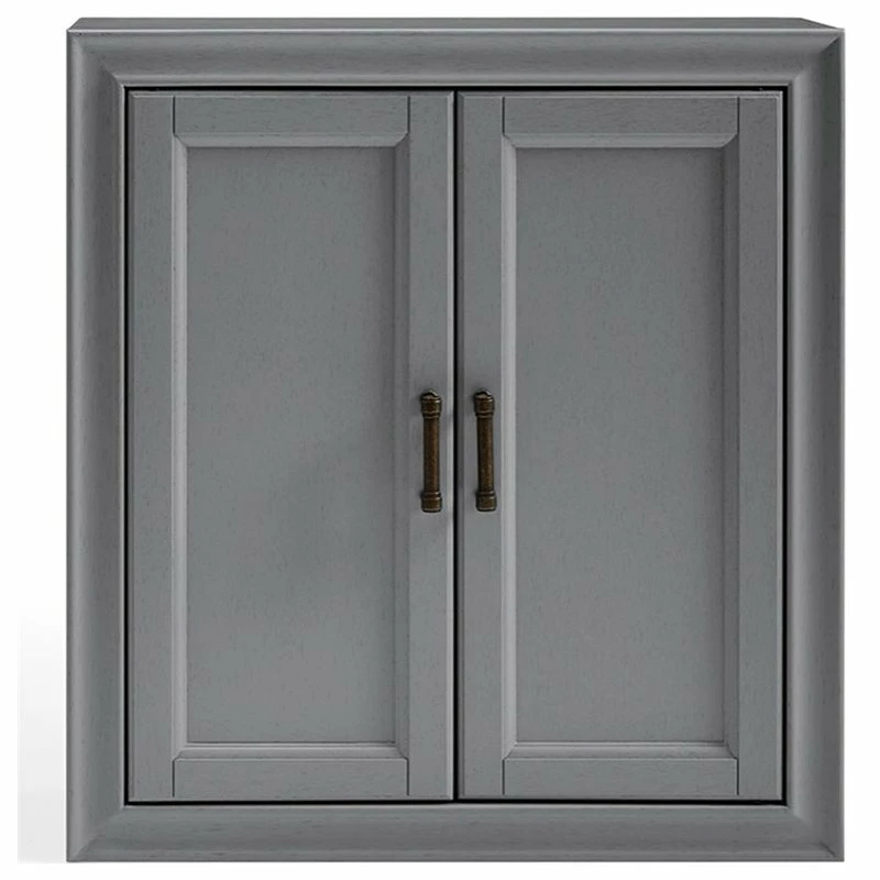 Add subtle storage space to your bathroom with this wall cabinet. Open the two craftsman style doors to reveal a deep-set area offering plenty of room for your toiletries, or medicines. The pine and wood veneer is finished with vintage gray polish and accented with antique bronze hardware, giving it character while keeping it chic. This wall cabinet is an easy fit for most home decors.