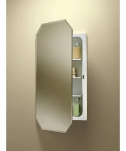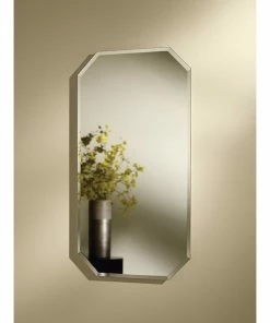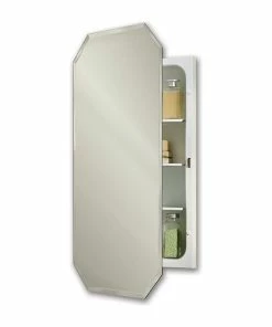- Frameless mirror door – 5/32in thick float glass octagon mirror door front with 1/2in beveled edges (1/2 BVL) – 24 gauge steel door back with white, heat cured, acrylic paint finish