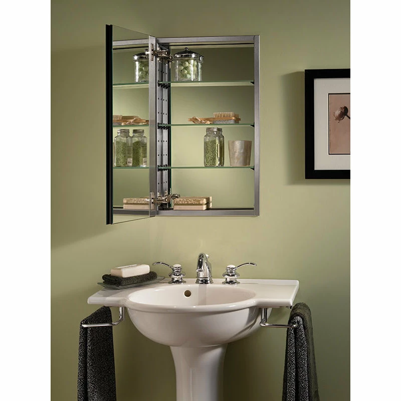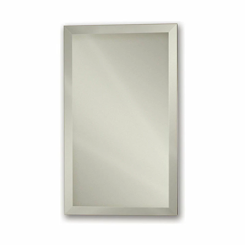 - Frameless Mirror door – 5/32in thick float glass mirror door front with 1in beveled edges, 4 sides , 3/32in float glass mirror door back with polished edges , MDF profile with matte black wrap forms the door inner core , 22 gauge stainless steel hinge plate