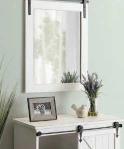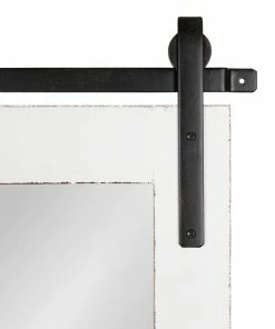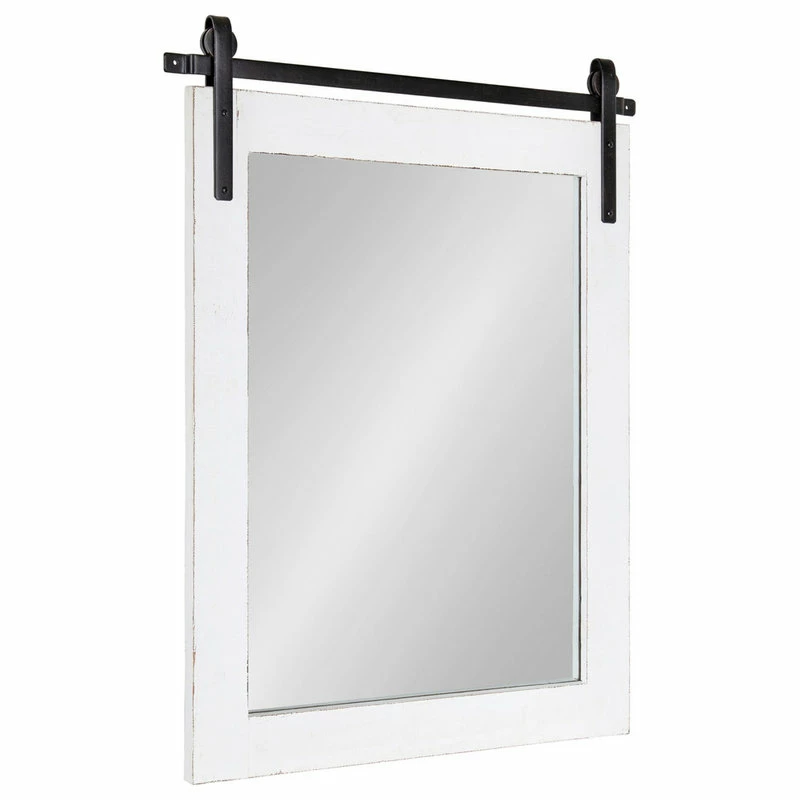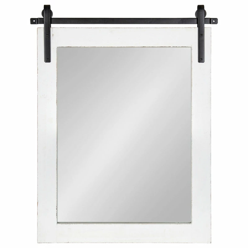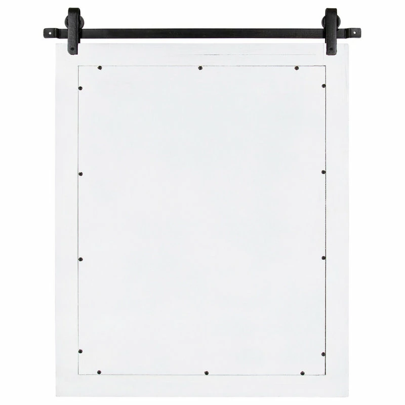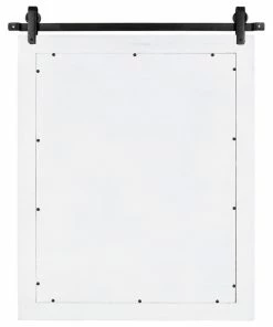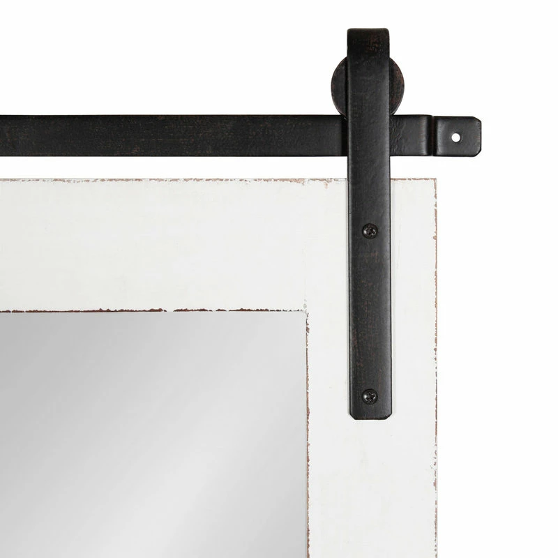 - RUSTIC FARMHOUSE MIRROR: The Cates Mirror features a barn door-inspired design with a coastal white finish and black iron bracket inspired by sliding barn doors