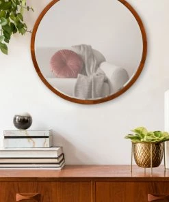 - MID-CENTURY DESIGN: This mirror has a simple, round shape, in addition to a mid-century walnut finish on the frame