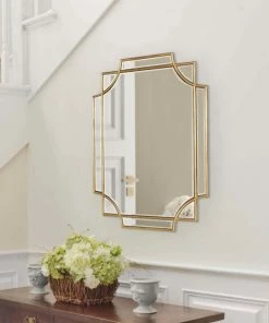 The Minuette wall mirror is the perfect way to expand your smaller spaces while also adding a timeless, beautiful accent piece. It features a glam, interlocking geometric frame, providing you with an eye-catching decor piece your friends and family won’t want to miss. With its sleek, refined gold finish on the frame, this decorative statement looks perfect in any space of your home, including the bedroom, bathroom, entryway, dining room, or kitchen. It looks fantastic as a piece of decor, but the Minuette also features plenty of function. Adding a mirror to your home reflects and spreads light, opening up your otherwise smaller spaces and bringing in dimension. You could even use the Minuette wall mirror as a chic bathroom wall mirror above your sink. This mirror stands at 24 inches tall by 18 inches wide, providing you with the perfect size to display on its own or multiples. This lightweight and sophisticated wall mirror is also easy to hang with secure metal D-ring hangers.