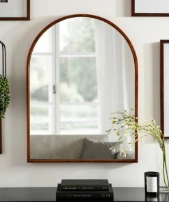 - MIDCENTURY DESIGN: The Valenti mirror was crafted with an arched shape, giving it a design that stands out while providing a midcentury aesthetic with its walnut brown finish